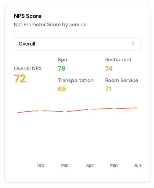 Monitor every corner of your hotel with targeted surveys for each department — no need to redirect guests to other platforms. From spa to housekeeping, F&B to front desk, keep your finger on the pulse of all operations in real-time. Catch issues before they become complaints, turn blind spots into actionable insights.